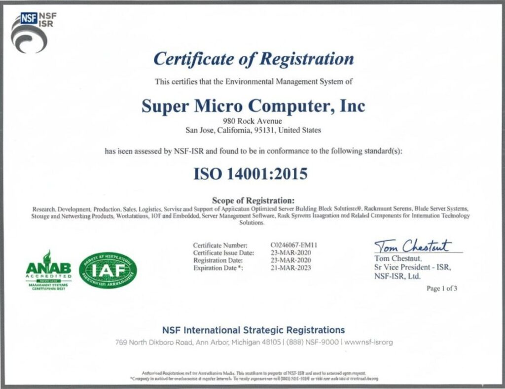 Supermicro сертифікований за стандартом ISO 14001, що підтверджує відповідність міжнародним вимогам екологічного менеджменту
